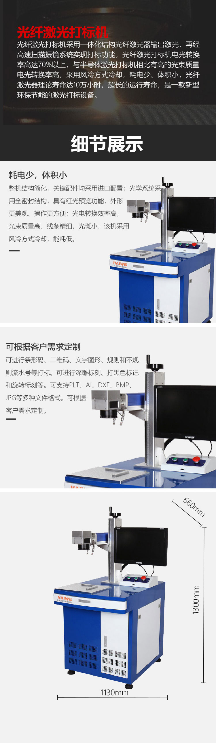 2、使用成本低廉:整機(jī)耗電不到500w,是燈泵浦固體打標(biāo)機(jī)的1/10,大大節(jié)省能耗支出。