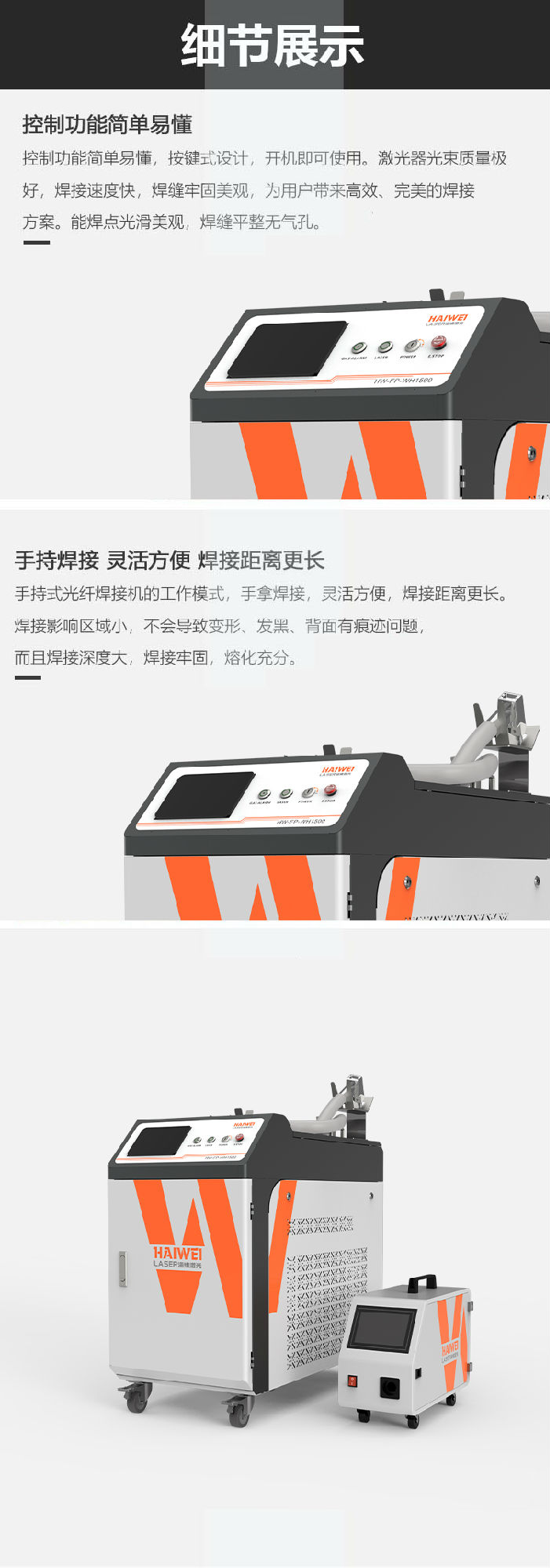 手持式激光焊接機(jī)配備進(jìn)口光纖,靈活方便,可實(shí)現(xiàn)戶外焊接,手持式焊槍的操作模式,可以對(duì)工件實(shí)現(xiàn)任意角度的焊接,適用各種復(fù)雜焊縫,各種器件的點(diǎn)焊。